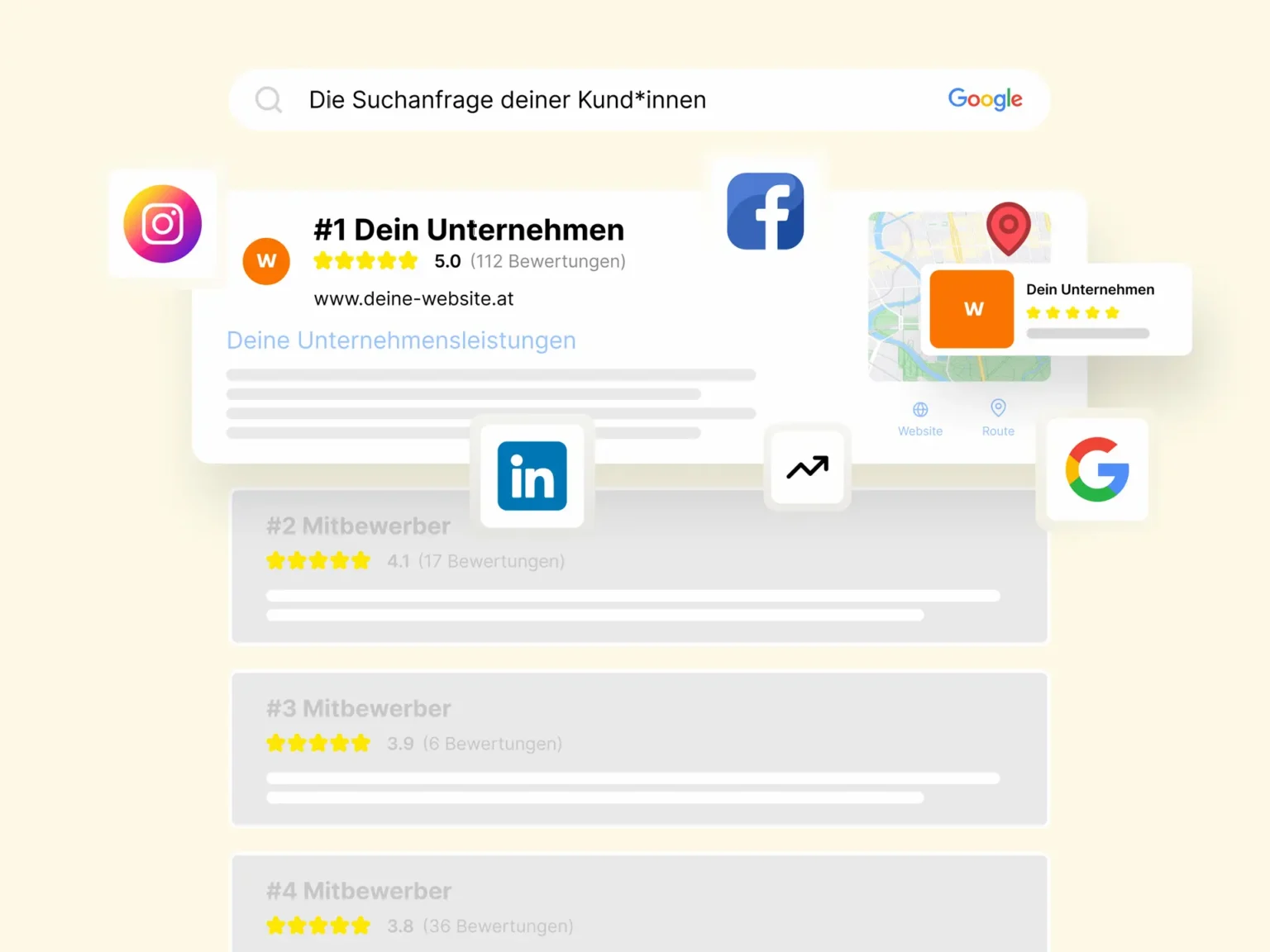 Google Business-Paket: Wir erstellen oder optimieren deinen Eintrag bei „Google Maps“ & in der Suche. So stellen wir sicher, dass deine Kunden dich nicht nur finden, sondern auch sofort alle wichtigen Infos wie Öffnungszeiten, Adresse und Bewertungen sehen. Die Kosten dafür liegen bei € 299 pro Profil.